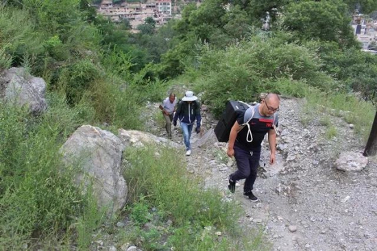 津云記者把攝像器材用繩子綁在身上登山選取拍攝地點。