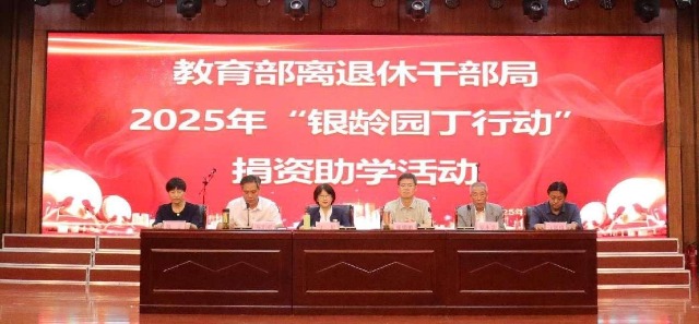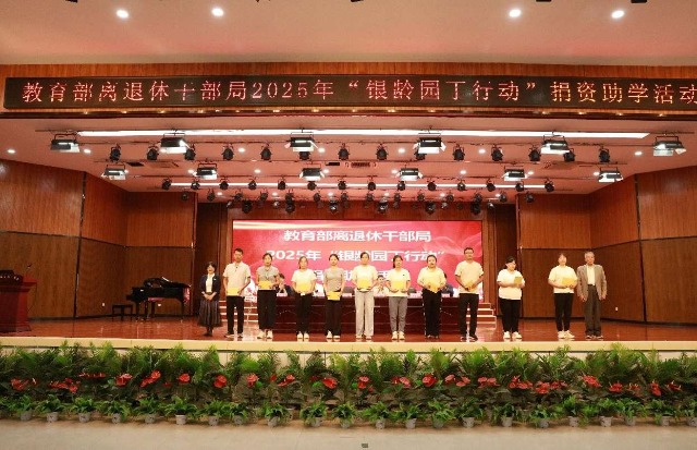 “銀齡園丁行動(dòng)”捐贈(zèng)儀式上,老同志代表向20名學(xué)生捐贈(zèng)助學(xué)款,教育部離退休干部局黨委書記、局長于虹,教育部離退休干部局原助理巡視員原永堂向10名鄉(xiāng)村特崗教師發(fā)放激勵(lì)金。