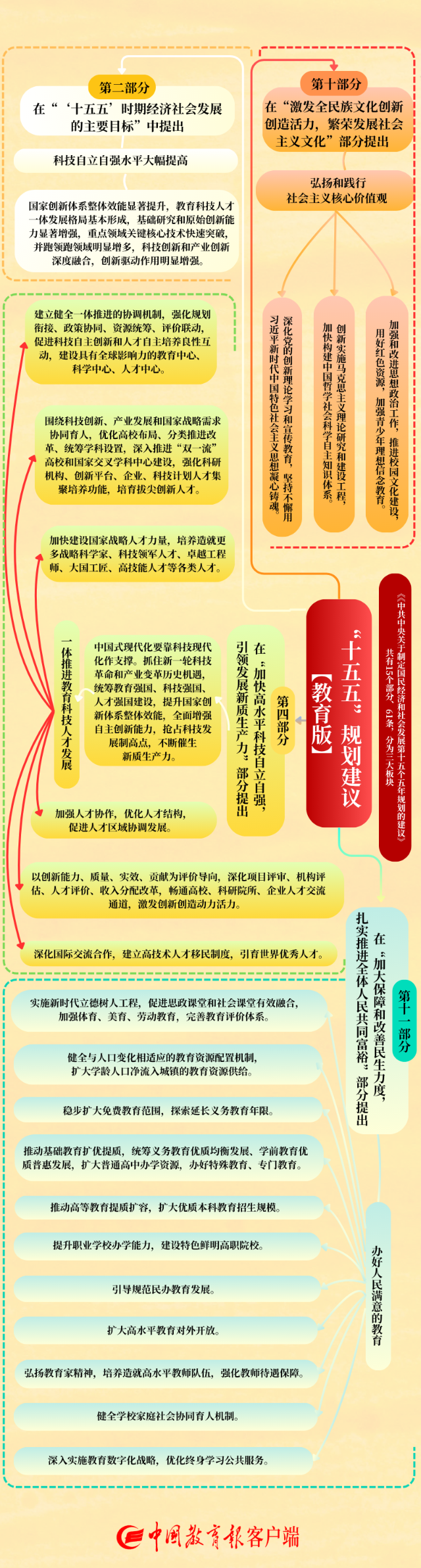 10月28日,《中共中央關(guān)于制定國(guó)民經(jīng)濟(jì)和社會(huì)發(fā)展第十五個(gè)五年規(guī)劃的建議》公布。一張思維導(dǎo)圖為你圖解“十五五”規(guī)劃建議中未來(lái)5年教育發(fā)展重點(diǎn),一起來(lái)看——