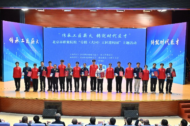 11月4日,北京市職業(yè)院?!皠谀#ù髧┕そ尺M校園”活動中,10名北京科技職業(yè)大學的學生為10位勞模工匠頒發(fā)“班級工匠導師”聘書。北京科技職業(yè)大學供圖