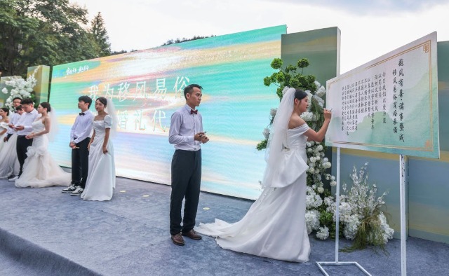 2025年8月20日,在浙江省諸暨市東白湖鎮(zhèn)斯宅村舉行的集體婚禮上,新人在移風(fēng)易俗倡議上簽名。新華社記者 徐昱 攝