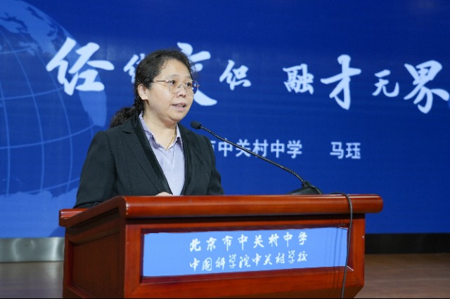 北京市中關(guān)村中學(xué)教師馬玨在作報告。學(xué)校供圖