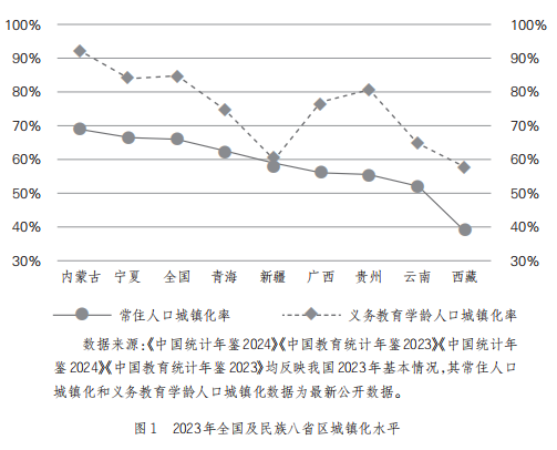 義務(wù)教育學(xué)齡人口城鎮(zhèn)化水平高于常住人口城鎮(zhèn)化水平,教育城鎮(zhèn)化的省際差異顯著。總體來看,義務(wù)教育學(xué)齡人口城鎮(zhèn)化水平高于常住人口城鎮(zhèn)化水平,均呈增長趨勢。2023年,八省區(qū)總體義務(wù)教育學(xué)齡人口城鎮(zhèn)化率為73.86%,較常住人口城鎮(zhèn)化率高16.07個百分點。民族地區(qū)教育城鎮(zhèn)化水平低于全國,2023年,八省區(qū)總體義務(wù)教育學(xué)齡人口城鎮(zhèn)化水平較全國平均水平低11.13個百分點,表明民族地區(qū)對鄉(xiāng)村義務(wù)教育學(xué)位的需求相對較大。分省份看,教育城鎮(zhèn)化水平的區(qū)域差異顯著。比如,與全國平均水平相比,內(nèi)蒙古、寧夏呈現(xiàn)常住人口與學(xué)齡人口城鎮(zhèn)化“雙高”特點,西藏、云南呈現(xiàn)“雙低”特征;貴州學(xué)齡人口城鎮(zhèn)化水平遠(yuǎn)高于常住人口城鎮(zhèn)化水平,新疆學(xué)齡人口城鎮(zhèn)化水平僅略高于常住人口城鎮(zhèn)化水平。義務(wù)教育學(xué)齡人口城鎮(zhèn)化水平高于常住人口城鎮(zhèn)化水平的程度,體現(xiàn)了城鄉(xiāng)教育質(zhì)量的差異和人們對優(yōu)質(zhì)教育的追求程度,各地需根據(jù)城鄉(xiāng)學(xué)齡人口的分布和發(fā)展趨勢,優(yōu)化教育資源配置。