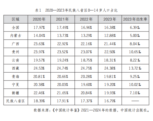 出生率和0—14歲人口占比總體高于全國,義務(wù)教育學(xué)位近期需求較大。2023年,人口出生率高于全國平均水平的民族省份有7個,西藏人口出生率最高,達(dá)到13.72‰,是全國平均水平(6.39‰)的2倍多;貴州、寧夏次之,人口出生率分別為10.65‰、10.02‰;內(nèi)蒙古人口出生率最低,為5.00‰,低于全國平均水平。從人口年齡結(jié)構(gòu)角度看,民族地區(qū)整體0—14歲人口占比高于全國,與全國共同呈現(xiàn)下降趨勢,表明在少子化、老齡化人口發(fā)展趨勢下,民族地區(qū)的義務(wù)教育學(xué)齡人口比例更高,學(xué)位需求相對大。分省份看,西藏0—14歲人口占比最高,呈現(xiàn)倒U型增長趨勢;其他7省份0—14歲人口占比均呈下降趨勢,僅內(nèi)蒙古0—14歲人口占比低于全國。新疆、廣西0—14歲人口占比降幅較大,2020—2023年降幅超2個百分點;西藏降幅最小,僅為0.15個百分點。各省份義務(wù)教育學(xué)齡人口占比及降幅不同,需分別做好學(xué)位需求預(yù)測和供給。