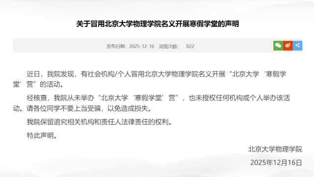 北京大學(xué):社會(huì)機(jī)構(gòu)/個(gè)人冒用其物理學(xué)院名義開(kāi)展寒假學(xué)堂2025年12月16日,北京大學(xué)物理學(xué)院發(fā)布聲明,有社會(huì)機(jī)構(gòu)/個(gè)人冒用北京大學(xué)物理學(xué)院名義開(kāi)展“北京大學(xué)‘寒假學(xué)堂’營(yíng)”的活動(dòng)。經(jīng)核查,北京大學(xué)物理學(xué)院從未舉辦“北京大學(xué)‘寒假學(xué)堂’營(yíng)”,也未授權(quán)任何機(jī)構(gòu)或個(gè)人舉辦該活動(dòng)。請(qǐng)各位同學(xué)不要上當(dāng)受騙,以免造成損失。