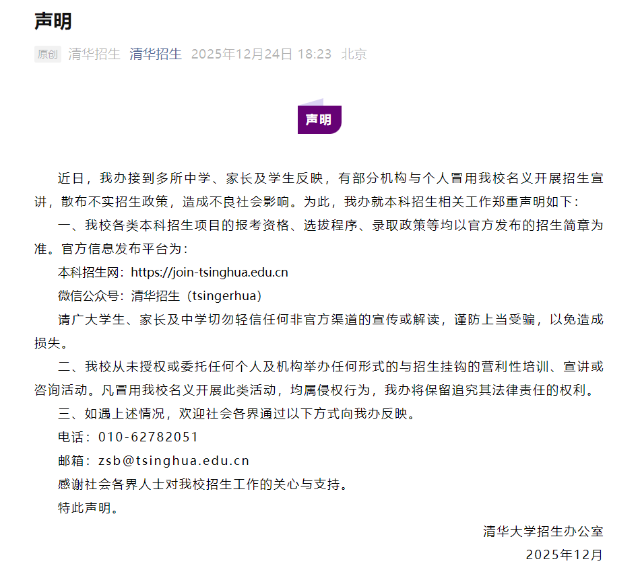 清華大學(xué):部分機(jī)構(gòu)與個(gè)人冒用學(xué)校名義開(kāi)展招生宣傳2025年12月24日,清華大學(xué)招生辦發(fā)布鄭重聲明。強(qiáng)調(diào)清華大學(xué)各類本科招生項(xiàng)目的報(bào)考資格、選拔程序、錄取政策等均以官方發(fā)布的招生簡(jiǎn)章為準(zhǔn),具體需關(guān)注清華招生微信公眾號(hào)或本科招生網(wǎng)。清華大學(xué)從未授權(quán)或委托任何個(gè)人及機(jī)構(gòu)舉辦任何形式的與招生掛鉤的營(yíng)利性培訓(xùn)、宣講或咨詢活動(dòng)。