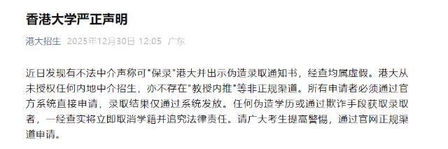 香港大學(xué):有不法中介聲稱可“保錄”港大2025年12月30日,?香港大學(xué)?通過(guò)“港大招生”發(fā)布嚴(yán)正聲明,近日發(fā)現(xiàn)有不法中介聲稱可“保錄”港大并出示偽造錄取通知書(shū),經(jīng)查均屬虛假。港大從未授權(quán)任何內(nèi)地中介招生,亦不存在“教授內(nèi)推”等非正規(guī)渠道。所有申請(qǐng)者必須通過(guò)官方系統(tǒng)直接申請(qǐng),錄取結(jié)果僅通過(guò)系統(tǒng)發(fā)放。任何偽造學(xué)歷或通過(guò)欺詐手段獲取錄取者,一經(jīng)查實(shí)將立即取消學(xué)籍并追究法律責(zé)任。
