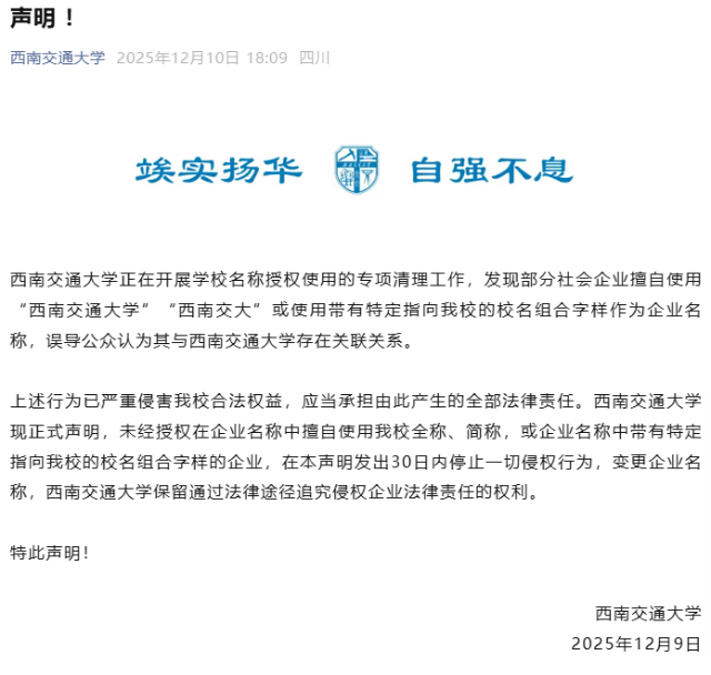 西南交通大學(xué):部分企業(yè)擅自使用校名2025年12月9日,西南交通大學(xué)發(fā)布聲明稱,該校正在開(kāi)展學(xué)校名稱授權(quán)使用的專項(xiàng)清理工作,發(fā)現(xiàn)部分社會(huì)企業(yè)擅自使用“西南交通大學(xué)”“西南交大”或使用帶有特定指向該校的校名組合字樣作為企業(yè)名稱,誤導(dǎo)公眾認(rèn)為其與西南交通大學(xué)存在關(guān)聯(lián)關(guān)系。學(xué)校稱,上述行為已嚴(yán)重侵害該校合法權(quán)益,應(yīng)當(dāng)承擔(dān)由此產(chǎn)生的全部法律責(zé)任。