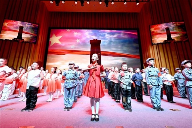 “我的家在東北松花江上……”小學(xué)部孩子們演繹的情景劇《松花江上》,以王二小、小蘿卜頭等英雄故事為脈絡(luò),讓抗戰(zhàn)歷史與家國(guó)情懷在稚嫩歌聲中交融;初中部《轉(zhuǎn)身向光》則聚焦一名“問(wèn)題學(xué)生”的蛻變,通過(guò)人文素養(yǎng)課程的引導(dǎo),這名學(xué)生從遲到懈怠到自律擔(dān)當(dāng),映射出教育對(duì)靈魂的喚醒;高中部大合唱《舟中曉望》更令人耳目一新——孟浩然的詩(shī)作與現(xiàn)代音樂(lè)碰撞,用和聲“繪”出云海初陽(yáng),讓古文在青春旋律中煥發(fā)新生。