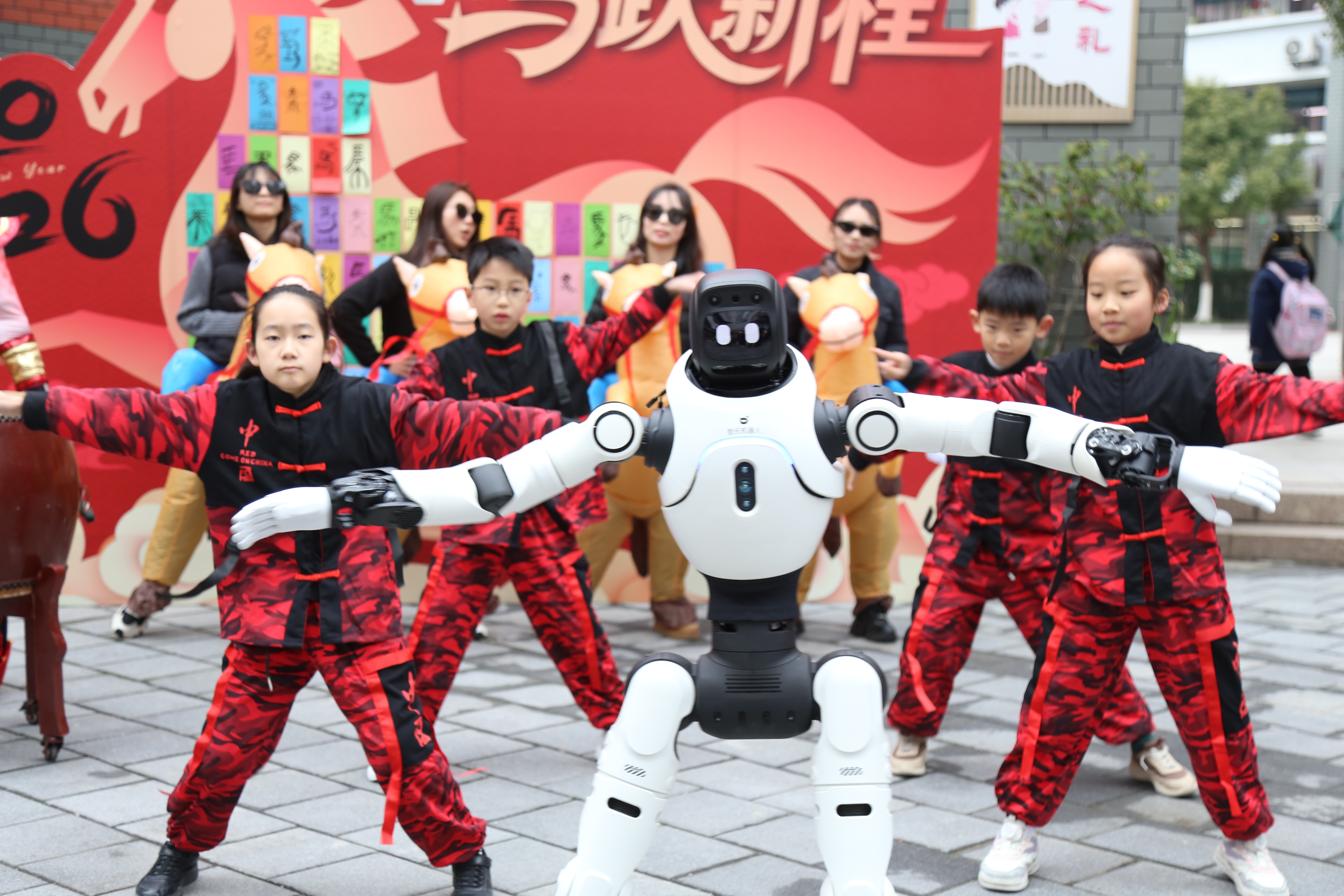清晨的連元街小學門口,沒有傳統(tǒng)的橫幅標語,取而代之的是一場別開生面的“科技派對”。只見人形機器人踏著動感的節(jié)拍靈活舞動機械臂,瞬間吸引剛進校門的孩子們駐足圍觀;不遠處,機器人大力敲響鑼鼓,激昂的節(jié)奏驅(qū)散了假期的慵懶;更有頭戴獅頭的機器人閃轉(zhuǎn)騰挪,將傳統(tǒng)舞獅演繹出別樣的未來感,引得歡呼聲此起彼伏。