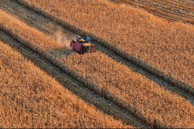2025年10月14日,在黑龍江同江市街津口赫哲族鄉(xiāng),農(nóng)戶在收獲玉米(無人機照片)。新華社發(fā)(劉萬平攝)