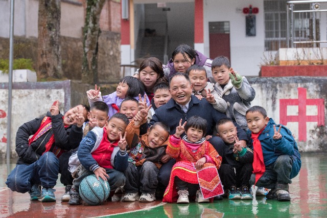 2025年2月18日,在云南文山壯族苗族自治州廣南縣,農(nóng)加貴和學生們在落松地小學操場上合影。新華社發(fā)(彭奕凱攝)