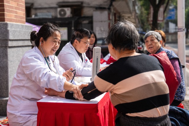 2026年3月5日,在湖南長沙市望城區(qū)高塘嶺街道雷鋒路社區(qū)雷鋒驛站,志愿者(左一)為市民測量血壓。新華社記者 陳思汗 攝