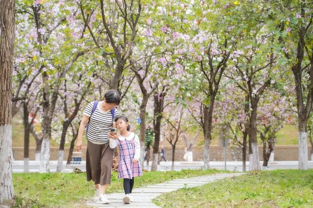 家長(zhǎng)帶著孩子暢游華南農(nóng)業(yè)大學(xué)紫荊花林。華南農(nóng)業(yè)大學(xué)宮粉羊蹄甲花海中,親子攜手穿行同賞爛漫春景。胡欣玲 攝