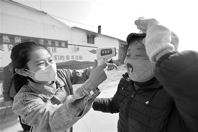 2月13日,山東聊城大學學生劉曉晨(左)在給村民測量體溫。近日,劉曉晨和山東體育學院的劉曉君、菏澤學院的劉曉靜自發(fā)組成大學生志愿服務隊,為聊城茌平區(qū)賈寨鎮(zhèn)邢胡劉村村民和行人進行體溫測量、信息登記,確保疫情防控措施落到實處。趙玉國 劉浩 攝
