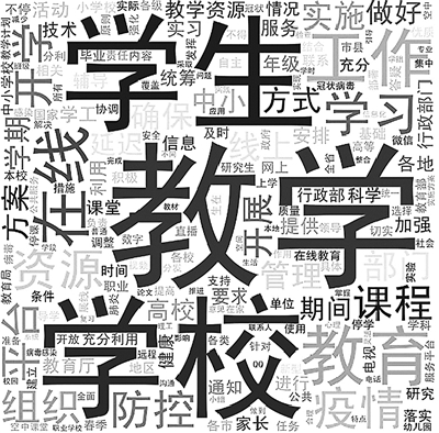 “停課不停學(xué)”如何落地?課題組搜集了全國(guó)26個(gè)省份和144個(gè)地級(jí)市的教育行政部門發(fā)布的“停課不停學(xué)”相關(guān)通知,將這些文件進(jìn)行文本合并、分詞處理和詞頻統(tǒng)計(jì),將相近詞進(jìn)行合并處理,形成了“停課不停學(xué)”相關(guān)文件詞云圖(見文尾),從數(shù)據(jù)看,通知中的重點(diǎn)詞匯包括:在線學(xué)習(xí)資源、學(xué)習(xí)平臺(tái)、教學(xué)方案、管理方式等,文件強(qiáng)調(diào)要做好疫情防控、教學(xué)組織和實(shí)施,并為線上教學(xué)提供相關(guān)的技術(shù)支持。