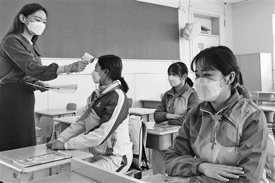 日前,青島市中小學(xué)陸續(xù)開(kāi)展模擬開(kāi)學(xué)一日流程演練活動(dòng)。演練中所有角色均由校長(zhǎng)干部、教師及工作人員扮演,針對(duì)學(xué)生在校的各個(gè)環(huán)節(jié)進(jìn)行情境推演、實(shí)戰(zhàn)演練。圖為青島大名路小學(xué)“學(xué)生”進(jìn)入教室后,任課教師逐一對(duì)每名“學(xué)生”進(jìn)行體溫檢測(cè)。