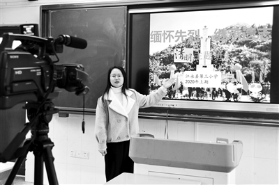 4月1日,湖南省江永縣第三小學(xué)教師毛曉在學(xué)校多媒體教室錄制清明主題班會視頻。日前,該校開展“緬懷革命先烈,傳承紅色精神”空中主題班會活動,通過網(wǎng)上瞻仰革命紀念地、烈士紀念碑、講述戰(zhàn)斗英雄故事等形式,深切緬懷革命先烈。田如瑞 攝