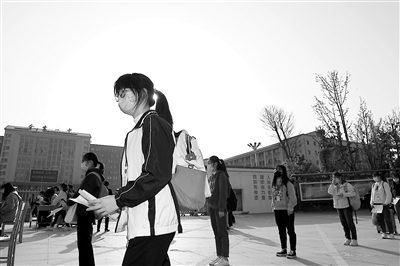 4月7日,在安徽省金寨第一中學(xué)門(mén)口,高三學(xué)生排隊(duì)準(zhǔn)備進(jìn)入校園。當(dāng)日,安徽省高三年級(jí)開(kāi)學(xué)復(fù)課。地處大別山腹地的金寨第一中學(xué)在做好疫情防控的基礎(chǔ)上,讓返校高三學(xué)生安心復(fù)習(xí)備考。