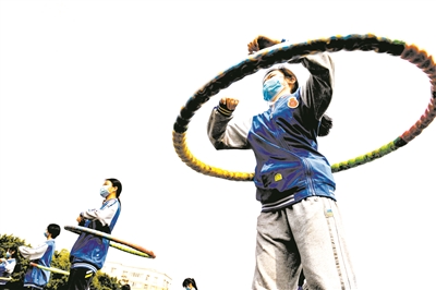 4月16日,剛剛復課的四川省成都市中和中學高二(7)班學生在進行呼啦圈運動。該校作為“陽光體育示范?!保陙黹_展了射擊、軟式棒壘球、呼啦圈、跆拳道、擊劍等系列特色體育項目,激發(fā)學生參與運動的興趣,增強學生體質。