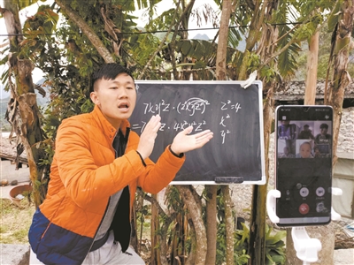 自家小院,芭蕉樹下,兩條長(zhǎng)凳、一臺(tái)電腦、一部手機(jī)和一塊小黑板,范澤良自己都不敢相信,他也做到了“停課不停教、不停學(xué)”。