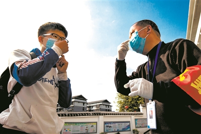 學(xué)校大門是校園疫情防控的第一道防線,間距排隊(duì)、測量體溫、物品消毒……層層“關(guān)卡”,保障學(xué)生安心入校。