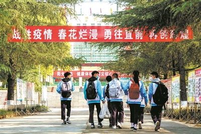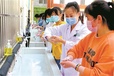 復(fù)課機(jī)會,來之不易。每一張安靜的書桌背后,都凝聚著許多人的付出和汗水。校園隨處可見鼓舞學(xué)生士氣的勵(lì)志橫幅,地面醒目位置粘貼保持距離的溫馨提示,校長、教師及志愿者們變身為“防疫員”“安檢員”,安排錯(cuò)時(shí)上下學(xué),按時(shí)清潔消殺校園,督促指導(dǎo)學(xué)生勤洗手,用愛溫暖守護(hù)學(xué)生。