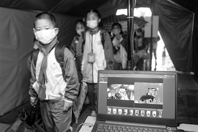 近日,四川省內(nèi)江市初中一、二年級和小學(xué)各年級開學(xué)復(fù)課。圖為該市東興區(qū)五星小學(xué)學(xué)生走進(jìn)校門外的小帳篷,經(jīng)過紅外線測溫儀測量后進(jìn)入校園。