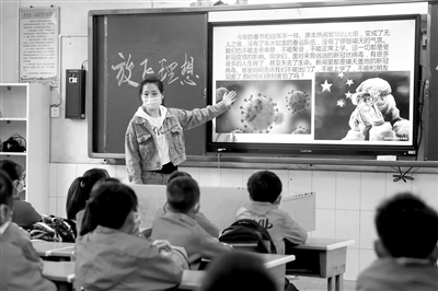 4月13日,四川省廣安華鎣市雙河小學四(2)班學生在聽老師宣講戰(zhàn)“疫”故事。當日,該市38所中小學校的4萬多名學生,在做好疫情防控工作的前提下,按照計劃全面有序開學復課。邱海鷹 劉南賢 攝