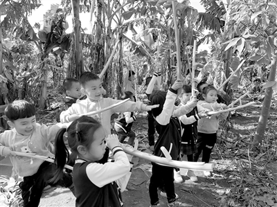 整合幼兒經(jīng)驗(yàn):捕捉幼兒生活的關(guān)鍵事件。只有與幼兒相關(guān)的主題,才能真正引發(fā)幼兒學(xué)習(xí)與探索的欲望。對于海島幼兒,海與島就是他們童年生活的全部想象,我們設(shè)計(jì)了“海丫丫上學(xué)了”“神奇的潿洲島”“海島花園”等主題活動(dòng),講述人與海島的故事,旨在讓幼兒認(rèn)識(shí)自己、了解環(huán)境,以培養(yǎng)幼兒熱愛家鄉(xiāng)、保護(hù)海島的家園情懷。潿洲島的火山土適宜芭蕉的生長,家家戶戶幾乎都種植芭蕉,在“神奇的潿洲島”主題中,我們設(shè)計(jì)“芭蕉熟了”系列活動(dòng),從芭蕉葉、芭蕉稈到芭蕉熟了,使幼兒片段、零碎的生活經(jīng)驗(yàn)變得系統(tǒng)和完整,真正感受到海島生活的樂趣。