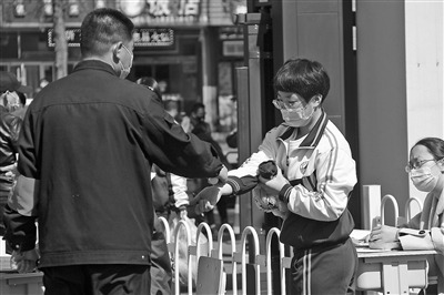 學(xué)生在保安的指揮下有序進(jìn)入校門(mén)并接受體溫檢測(cè)。4月23日,河北省唐山市樂(lè)亭縣第一中學(xué)高三學(xué)生重返分別了3個(gè)多月的校園。據(jù)了解,按照河北省教育廳發(fā)布的開(kāi)學(xué)通知精神,學(xué)校根據(jù)實(shí)際制定開(kāi)學(xué)工作方案,備足疫情防控物資,對(duì)學(xué)校環(huán)境衛(wèi)生進(jìn)行了徹底整治,并通過(guò)了當(dāng)?shù)匦l(wèi)健、市場(chǎng)監(jiān)管等部門(mén)的聯(lián)合核驗(yàn)。目前,復(fù)課教學(xué)已進(jìn)入正常狀態(tài),800多名學(xué)子正以飽滿的狀態(tài)全力備考。