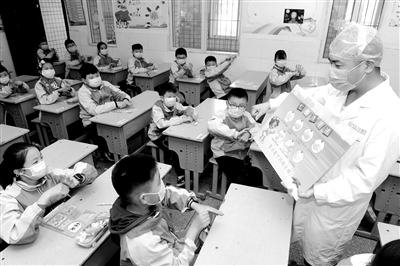 4月26日,安徽省阜陽市蓮池小學疫情防控指導員向小學生們講授七步洗手法。當日,阜陽市小學四、五、六年級以及初二和高二年級的學生正式開學復課。各校通過開展“科學防疫安全防護”主題班會,向學生們講解正確佩戴口罩等知識,引導學生做好個人防護。王彪 攝