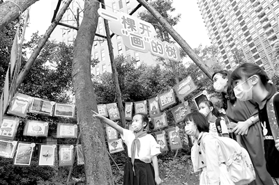 5月6日,四川省成都高新區(qū)菁蓉小學(xué)師生在觀看“宅家畫展”。當(dāng)日,該校一至四年級學(xué)生返校復(fù)課,學(xué)校舉辦“宅家畫展”,在入校便道兩旁打造了一條200多米的文化長廊,展示學(xué)生居家期間創(chuàng)作的近千幅繪畫作品。