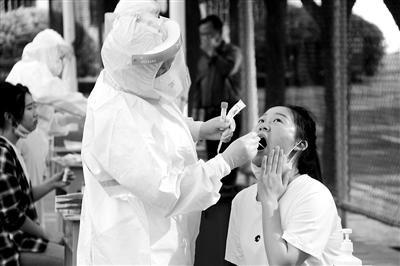 近日,湖北省丹江口市人民醫(yī)院派出醫(yī)護(hù)人員,對漢江科技學(xué)校首批返校的648名學(xué)生統(tǒng)一進(jìn)行了核酸檢測,確保人人都測、一個不漏。圖為醫(yī)護(hù)人員正在為學(xué)生采集咽拭子取樣檢測。錢芹 攝
