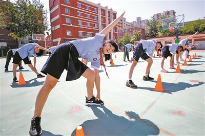 6月1日,北京市豐臺(tái)區(qū)豐臺(tái)第一小學(xué)通過(guò)開(kāi)展心理輔導(dǎo)活動(dòng)、做手指操、發(fā)放健康防疫包、品嘗節(jié)日蛋糕等活動(dòng),拉開(kāi)了復(fù)學(xué)“第一課”大幕,帶領(lǐng)學(xué)生度過(guò)這個(gè)特殊的“六一”兒童節(jié)。圖為學(xué)生進(jìn)行體能恢復(fù)訓(xùn)練。本報(bào)記者 單藝偉 攝