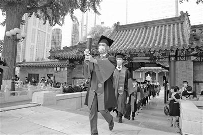 典禮通過播放視頻回顧了學(xué)校新百年以來的事業(yè)發(fā)展進(jìn)程,總結(jié)了院校在新冠肺炎疫情防控中的貢獻(xiàn),詮釋了新時(shí)期協(xié)和人的使命與擔(dān)當(dāng)。北京協(xié)和醫(yī)學(xué)院校長王辰回顧了瘟疫對(duì)人類歷史的影響,凸顯了醫(yī)學(xué)在人類生存和發(fā)展中的至關(guān)重要性,反映了醫(yī)學(xué)研究的未知性與挑戰(zhàn)性,強(qiáng)調(diào)了當(dāng)代醫(yī)學(xué)人士所應(yīng)肩負(fù)的責(zé)任與擔(dān)當(dāng)。他期望協(xié)和學(xué)子們能夠以“無我為自我”、以“志遠(yuǎn)、德厚、才盛”、以“照護(hù)人類醫(yī)學(xué)”的世界觀,貫徹到整個(gè)人生過程,不斷提高自身境界,最終實(shí)現(xiàn)一個(gè)知識(shí)分子的美好圓滿人生。圖為優(yōu)秀畢業(yè)生代表入場(chǎng)儀式。郭志晨 攝 邢少潭 文