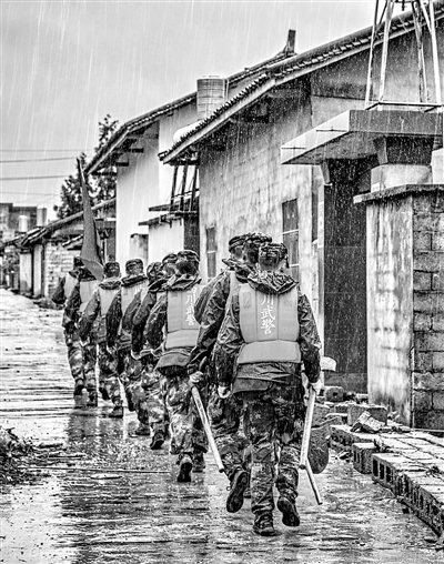 了解現(xiàn)場(chǎng)情況后,龔秀海與戰(zhàn)友一起搭建安置點(diǎn),安置受災(zāi)群眾,協(xié)助民政部門(mén)搬運(yùn)飲用水、食品等物資,并搭建救災(zāi)帳篷,確保轉(zhuǎn)移群眾有住處、有飯吃、有安全飲用水。在為期四天的抗洪救災(zāi)過(guò)程中,龔秀海經(jīng)常凌晨?jī)牲c(diǎn)多才睡,六點(diǎn)起床準(zhǔn)備當(dāng)天的救災(zāi)工作,由于時(shí)間緊急,天降暴雨時(shí),就在運(yùn)兵大巴上吃飯,天氣稍微好一點(diǎn)就直接在路邊吃起盒飯,然后立刻投入到救災(zāi)工作中去。夜里淋著大雨搬運(yùn)物資,白天手握鋤頭、鐵鍬清理路面,赤手拖著一袋袋淤泥……此次救援工作中,武警官兵共疏散安置受災(zāi)群眾500余人,搭建帳篷180余頂,協(xié)助群眾搬運(yùn)轉(zhuǎn)移物資13噸。