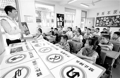 日前,在江蘇省蘇州市大儒中心小學(xué)校,一名交警為學(xué)生講解交通安全知識。近日,各地學(xué)校開展“暑假安全課”主題活動,加強(qiáng)學(xué)生們的安全意識。
