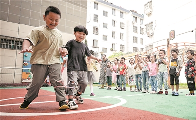 7月14日,幼兒園小朋友在進行綁腿跑。當日,江蘇省淮安市清江浦區(qū)新民路幼兒園開展多項趣味體育活動,引導(dǎo)小朋友們通過開心運動強健體魄。趙啟瑞 攝(新華社發(fā))