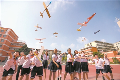 7月16日,安徽省淮北市第三實(shí)驗(yàn)小學(xué)學(xué)生在進(jìn)行航模演示。當(dāng)日,該校聯(lián)合淮北市航模協(xié)會(huì)開展“科技體育進(jìn)校園”暑期航??破栈顒?dòng),培養(yǎng)學(xué)生的航空航天科技興趣和動(dòng)手能力,豐富學(xué)生的暑期生活。萬(wàn)善朝 攝
