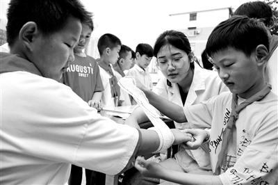 7月23日,在江蘇省鎮(zhèn)江市李家大山社區(qū),江蘇大學(xué)急救協(xié)會志愿者指導(dǎo)小朋友學(xué)習(xí)傷口包扎技能。志愿者們?yōu)樾∨笥验_設(shè)暑期安全課,向小朋友傳授傷口包扎、心肺復(fù)蘇、防溺水等安全知識和救護技能,保障孩子們快樂安全度假。石玉成 攝