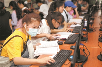 7月26日,重慶市永川北山中學(xué)考生在網(wǎng)上填報(bào)志愿。當(dāng)日,重慶市2020年普通高校招生全國(guó)統(tǒng)考志愿填報(bào)工作啟動(dòng),該??忌峙哌M(jìn)學(xué)校計(jì)算機(jī)室填報(bào)高考志愿。