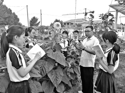 從開(kāi)窩、撒種、點(diǎn)水、施肥,再到發(fā)芽、滅蟲(chóng)、開(kāi)花、結(jié)籽……在山東省安丘市凌河鎮(zhèn)凌河小學(xué)的種植園里,每天都有師生前來(lái)觀察、記錄、探究,在這里學(xué)生不僅體驗(yàn)到了種植的樂(lè)趣,豐富了種植常識(shí),還體會(huì)到了勞動(dòng)的艱辛,培養(yǎng)了感恩情懷。濰坊市教育局推廣了該校的做法。圖為“葵花小園丁”正在聆聽(tīng)生物園老師的講解,仔細(xì)記錄葵花生長(zhǎng)的特性。