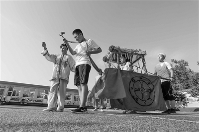 8月4日,民間藝人在河北省遵化市平安城鎮(zhèn)大麻各莊村校園操場指導(dǎo)孩子們學(xué)習(xí)民俗節(jié)目。