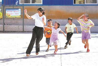 8月5日,在湖南省花垣縣麻栗場鎮(zhèn)溜豆村小學(xué),大學(xué)生與孩子們一起做游戲。湖南女子學(xué)院和長沙航空職業(yè)技術(shù)學(xué)院的大學(xué)生5年來堅持到該村開展暑期支教活動,讓孩子們快樂過暑期。龍恩澤 攝