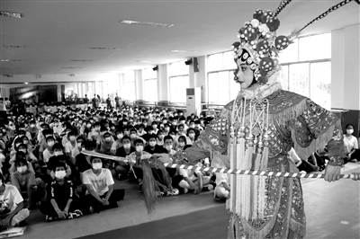 8月4日,在湖北省丹江口市漢江科技學校,戲曲演員為366名建檔立卡“兩后生”職業(yè)技能培訓班學生表演豫劇《破洪州》。當日,丹江口市人民藝術劇院主辦的“戲曲進校園”活動走進漢江科技學校,讓學生零距離感受傳統戲曲的魅力。錢芹 攝