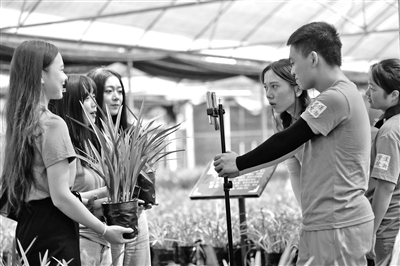“我們舉辦直播,不僅為了‘帶貨’,更多是想讓青年學(xué)生積極投身實踐鍛煉,增長才干,在鄉(xiāng)村振興和脫貧攻堅中貢獻力量。”瀟湘學(xué)院學(xué)工辦副主任錢寧說。圖為通道侗族自治縣萬佛山鎮(zhèn)蘭花基地,瀟湘學(xué)院學(xué)生在直播推介當?shù)氐奶m花。