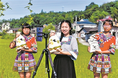 近日,在湖南省湘西土家族苗族自治州花垣縣麻栗場鎮(zhèn)溜豆村,暑期返鄉(xiāng)大學生楊莎麗(中)、龍歡(左)和游杰燕一起拍視頻宣傳推銷村里的優(yōu)質生態(tài)大米“溜豆大米”,助農增收。每年放假時,大學生陸續(xù)返鄉(xiāng),有的積極參與村里扶貧工作,有的主動到村小支教,發(fā)揮個人專業(yè)特長助力家鄉(xiāng)建設。
