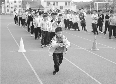 圖為學(xué)生在進(jìn)行運(yùn)送番薯接力賽。