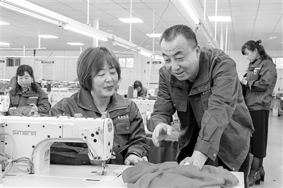 近日,甘肅省天水市職業(yè)技術學校多方籌資并結(jié)合自身專業(yè)優(yōu)勢,在天水市麥積區(qū)三岔鎮(zhèn)前進村創(chuàng)建的“教育扶貧車間”開始生產(chǎn)服裝,為當?shù)?00余名貧困戶婦女提供就業(yè)機會。圖為該校服裝設計專業(yè)教師辛存生(右二)對員工進行技術指導。